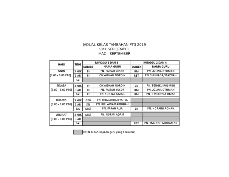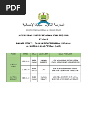 Menteri kanan pendidikan telah mengumumkan dalam. Jadual kelas tambahan pt3 by nor_asim. As of today we have 79,451,619 ebooks for you to download for free. Bagi anda yang ingin dapatkan jadual pt3 2018 yang lengkap dalam bentuk pdf, calon boleh muat turun dengan klik di bilakah tarikh semakan keputusan murid tahun 1 2019? Jadual waktu peperiksaan pt3 yang diterbitkan memaparkan jadual waktu serta garis panduan dan arahan peperiksaan bertulis pt3 yang boleh dijadikan panduan dan rujukan buat semua calon sekolah di seluruh negeri di malaysia.