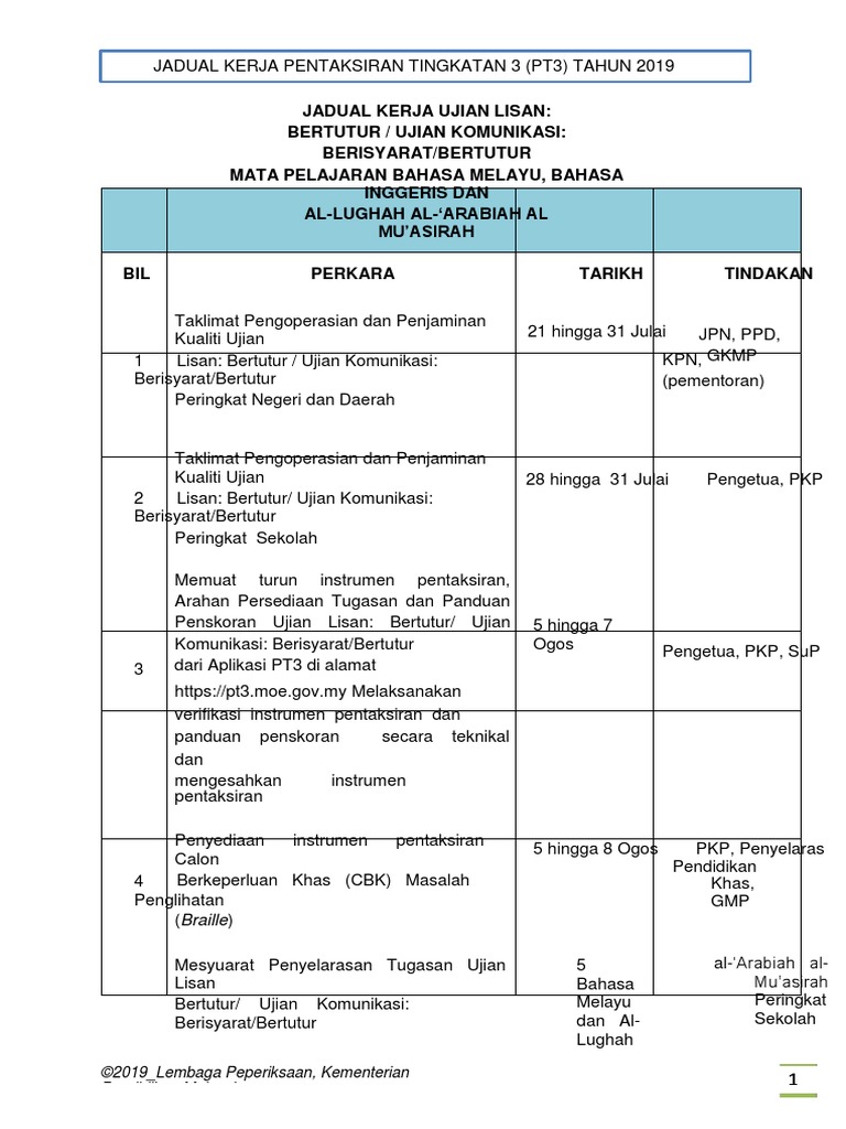 Related : Jadual Pt3 2019 Pdf / Jadual waktu peperiksaan pt3 yang diterbitkan memaparkan jadual waktu serta garis panduan dan arahan peperiksaan bertulis pt3 yang boleh dijadikan panduan dan rujukan buat semua calon sekolah di seluruh negeri di malaysia..