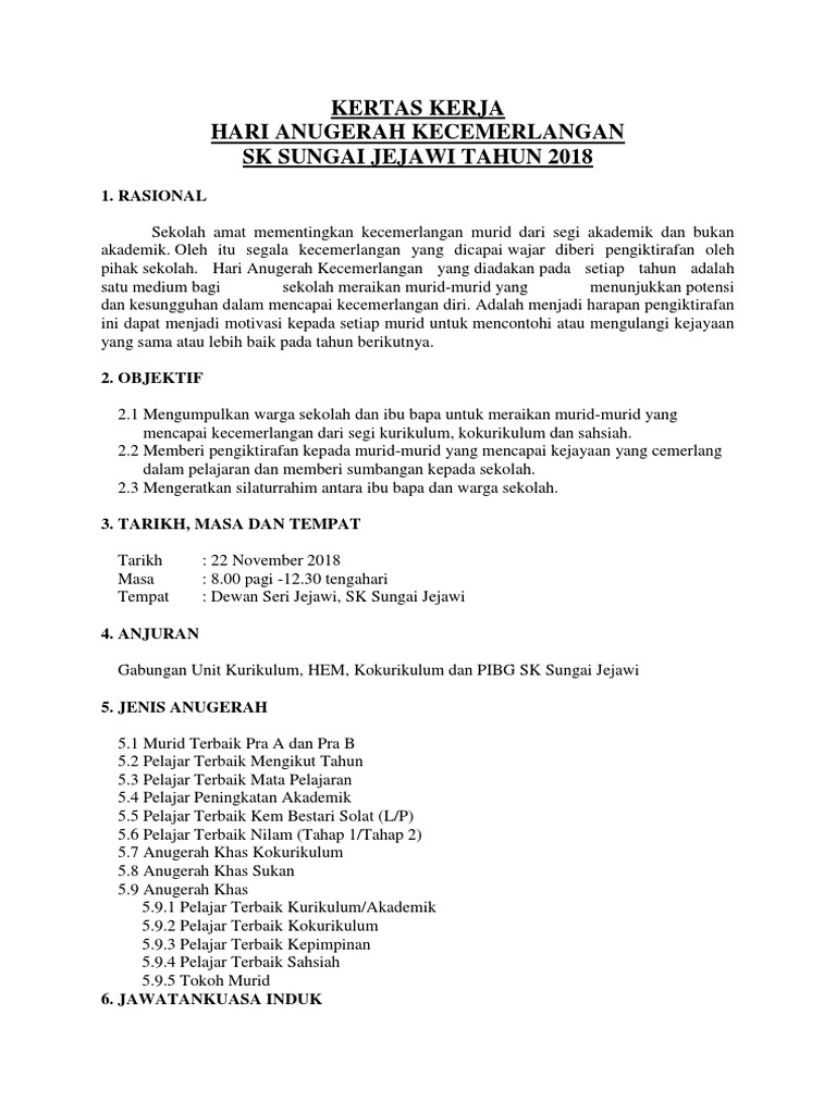 Kertas kerja hari anugerah kecemerlangan hem & kokurikulum kali pertama smk bukit kuching tengah. Adalah diharapkan ilmu yang dikongsikan ini akan mendatangkan manfaat kepada semua. Ia dapat meningkatan akademik dan disiplin pelajar. Hari anugerah kecemerlangan merupakan hari yang penting di setiap sekolah, ia merupakan hari di mana tanpa sokongan dan kerjasama dari semua mungkin program tidak dapat berjalan dengan lancar. Contoh kertas kerja hari anugerah kecemerlangan.
