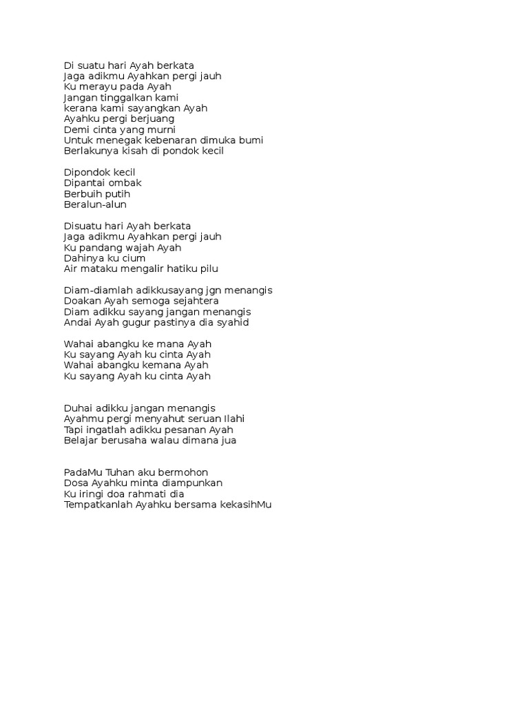 Di suatu hari ayah berkata jaga adikmu ayah kan pergi jauh ku merayu pada.